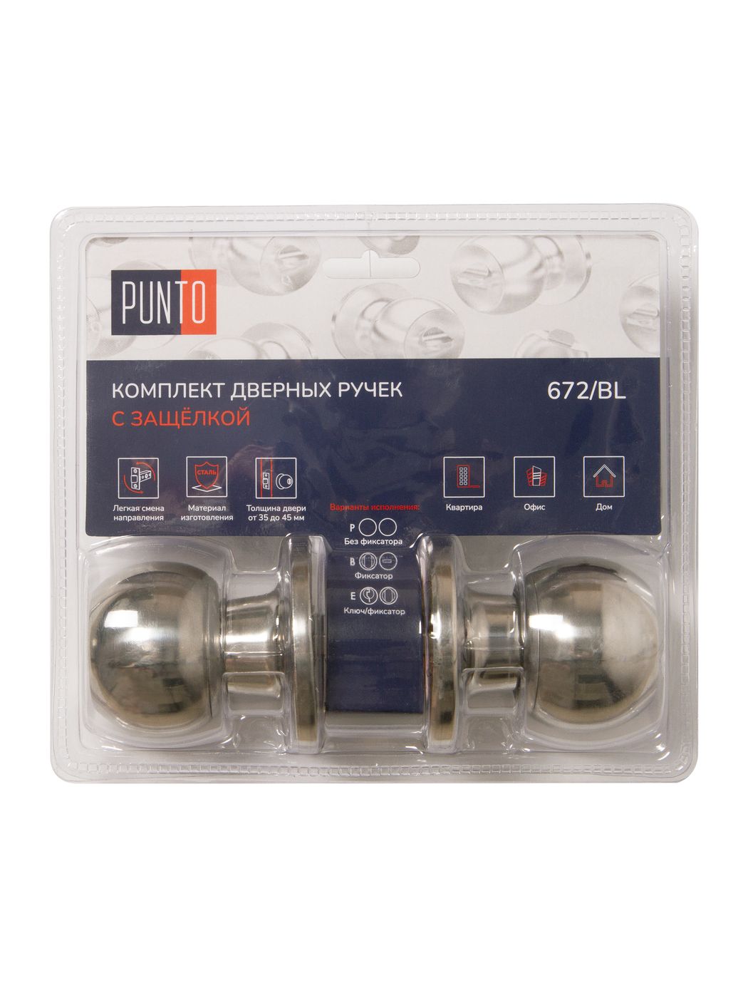 Комплект дверных ручек с защелкой (KNOB) Punto предназначен для установки в межкомнатные двери толщиной 35-45 мм. Подходит для дверей правого и левого открывания. Гальваническое покрытие прошло тест на устойчивость к коррозии в соляном тумане и соответствует 1 классу ГОСТ. Бэксет защелки регулируется - 60/70 мм. Материал изготовления: сталь. Комплектация: защелка, ответная планка с декоративной заглушкой, дверные ручки, крепежная фурнитура, шаблон и инструкция по установке.