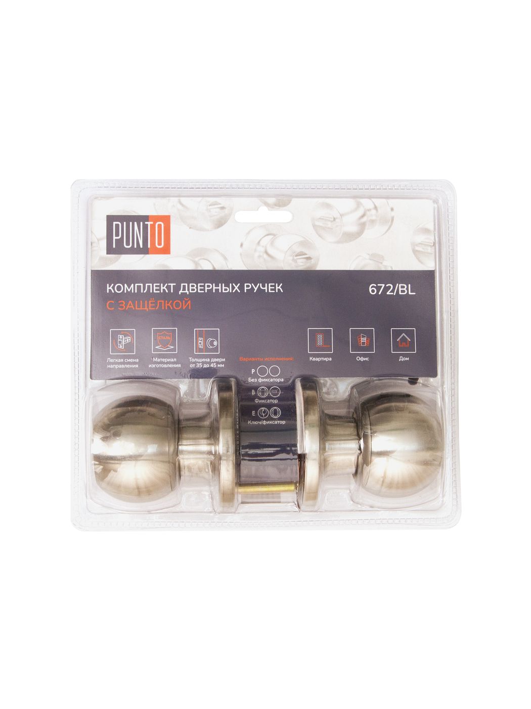Комплект дверных ручек с защелкой (KNOB) Punto предназначен для установки в межкомнатные двери толщиной 35-45 мм. Подходит для дверей правого и левого открывания. Гальваническое покрытие прошло тест на устойчивость к коррозии в соляном тумане и соответствует 1 классу ГОСТ. Бэксет защелки регулируется - 60/70 мм. Материал изготовления: сталь. Комплектация: защелка, ответная планка с декоративной заглушкой, дверные ручки, крепежная фурнитура, шаблон и инструкция по установке.