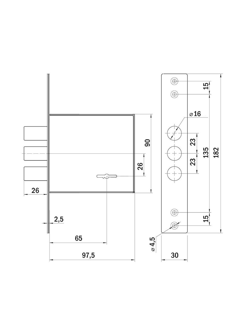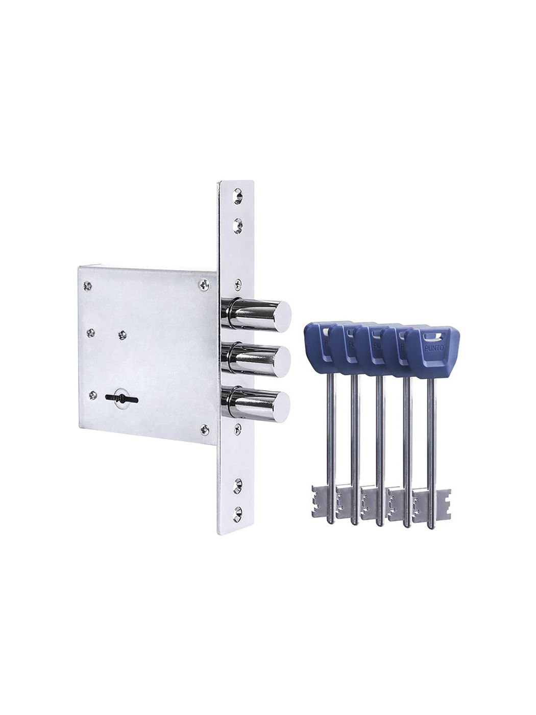 Замок врезной сувальдный Punto MDV30S с тремя ригелями предназначен для установки во входные и технические металлические двери. Стальной оцинкованный корпус. Универсальная установка, подходит для левых и правых дверей. Бэксет- 65 мм. Выход ригелей- 26 мм. Диаметр ригелей -16 мм. В комплект входят: врезной замок, 5 ключей с эргономичной пластиковой головкой для дверей толщиной 40-120мм, крепежная фурнитура.Характеристики